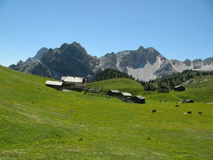 Noch mehr Seen sehen: Abstecher zum Hochalpensee (2.250 m), einem der schönsten Dolomitenseen im Naturpark Fanes-Sennes-Prags. Von den Hochalpenhütten dem breiten Weg bis zum Kreuzjoch folgen, nach rechts abbiegen ins Lapadurestal und links leicht aufwärts zum schön gelegenen See. Markierungen: Nr. 19 und Nr. 3. Man muss ca. 1 Stunde für den Abstecher mehr einplanen. Rückweg 40 Minuten.