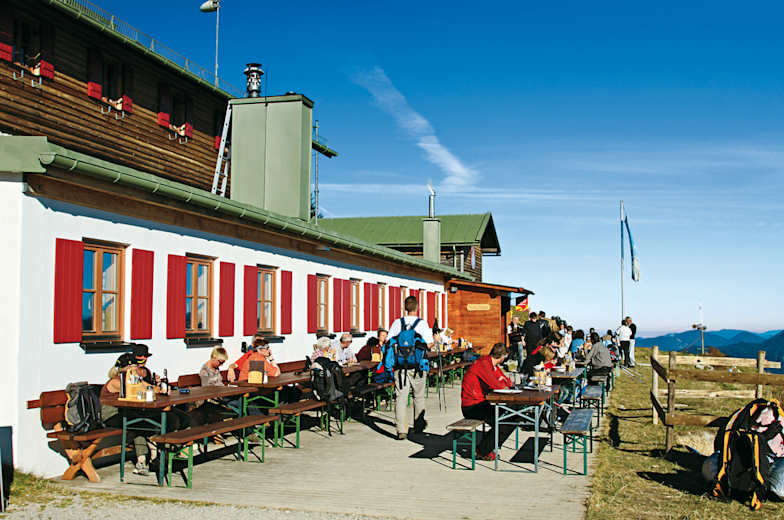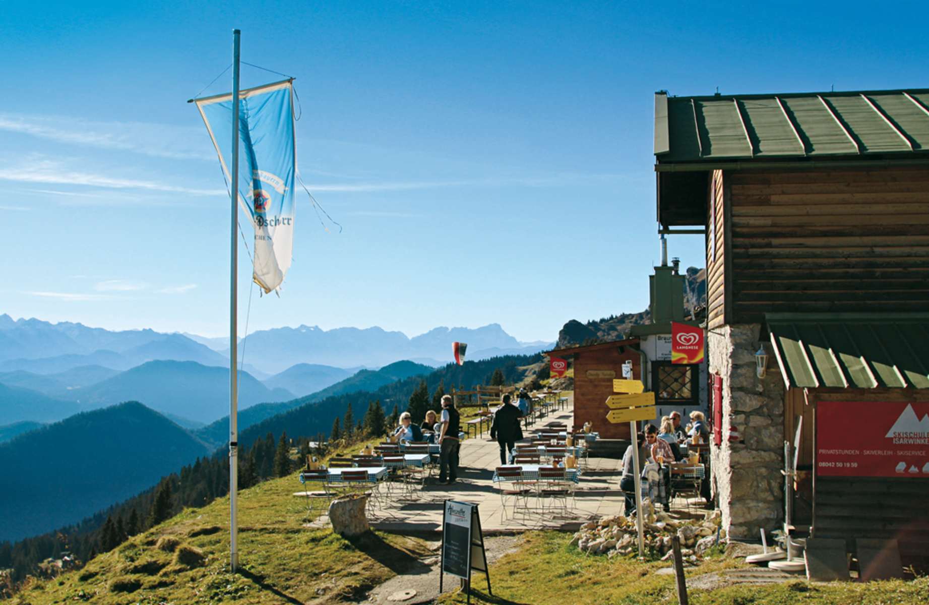 An der Hütte lässt es sich herrlich sitzen und die umfassende Aussicht genießen: zur Zugspitze, ins Karwendel und bis zum Großglockner. Zu unseren Füßen breitet sich der Isarwinkel aus, hier verlässt die Isar die Berge und fließt hinaus ins flache Alpenvorland. Viele Wanderer zieht es jedoch noch immer zu Fuß aufs Brauneck.