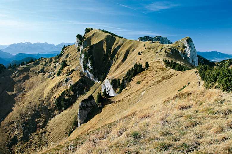 Nun folgen wir dem Grat nach Westen, umgehen den Schrödelstein südseitig, erklimmen das Stangeneck und wandern, immer am Kamm entlang, am Vorderen Kirchstein vorbei zum Latschenkopf, 1.712 m. Durch steile, felsdurchsetzte Latschengassen steigen wir zum Feichtecksattel, 1.630 m, ab, wo sich der Weg teilt: Geradeaus geht es über die Achselköpfe zur Benediktenwand und zur Tutzinger Hütte, rechts unter den Achselköpfen durch ebenfalls zur Benediktenwand und zur Tutzinger Hütte oder über den Probstalmkessel bis ins Isartal. Links führt unser Weg durch die Südflanke des Latschenkopfs und hinunter zur Stie-Alm, 1.490 m.