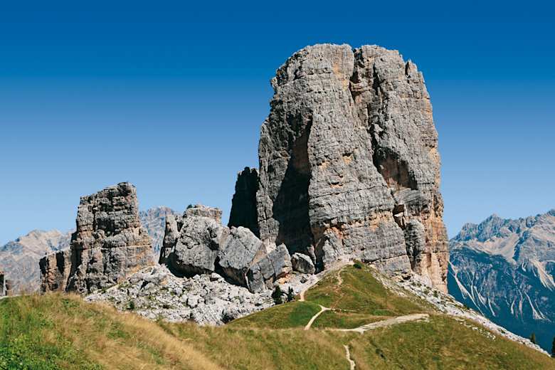 Etwas unterhalb des Nuvolaugipfels liegen die Cinque Torri, mächtige Felsblöcke, die einst einen einzigen Felsturm bildeten. Ein Abstecher zu diesem einzigartiger Klettergarten lohnt sich.