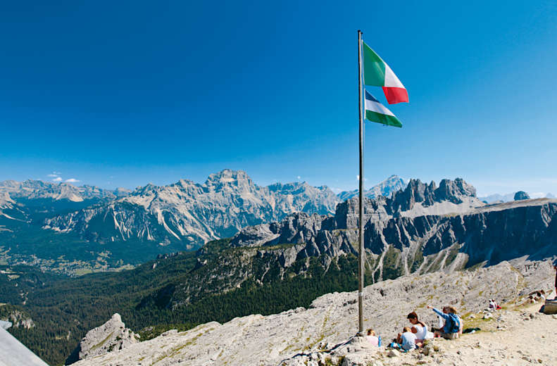 2. Wie beschrieben auf Weg 424 bis zum Rifugio Scoiattoli, auf dem Fahrweg kurz Richtung Rifugio Cinque Torri, dann rechts auf dem Weg 443 Richtung Passo Giau wandern, bis rechts die Via Ferrata Ra Gusela abzweigt. Auf dem gesicherten Steig hinauf zum Nuvolau, 3 Stunden, 800 Hm.