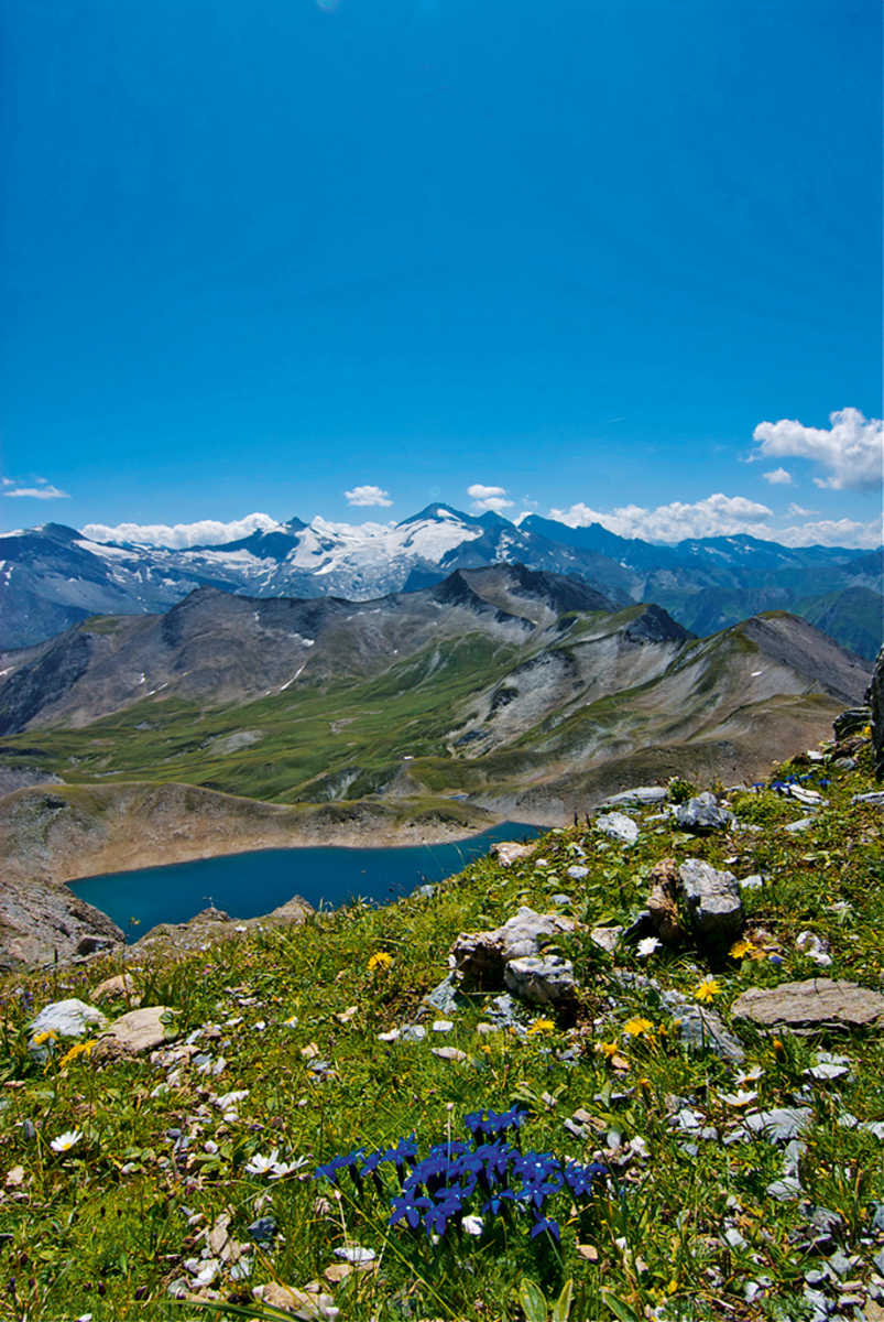 Genialer Ausblick auf den Weiterweg: der enzianblaue Junssee, der begrünte Gschützspitzsattel; dahinter der Olperer mit Tuxer Ferner und links davon schon die Friesenbergscharte. Foto: Dirk Steuerwald/Stephan Baur/Vera Biehl