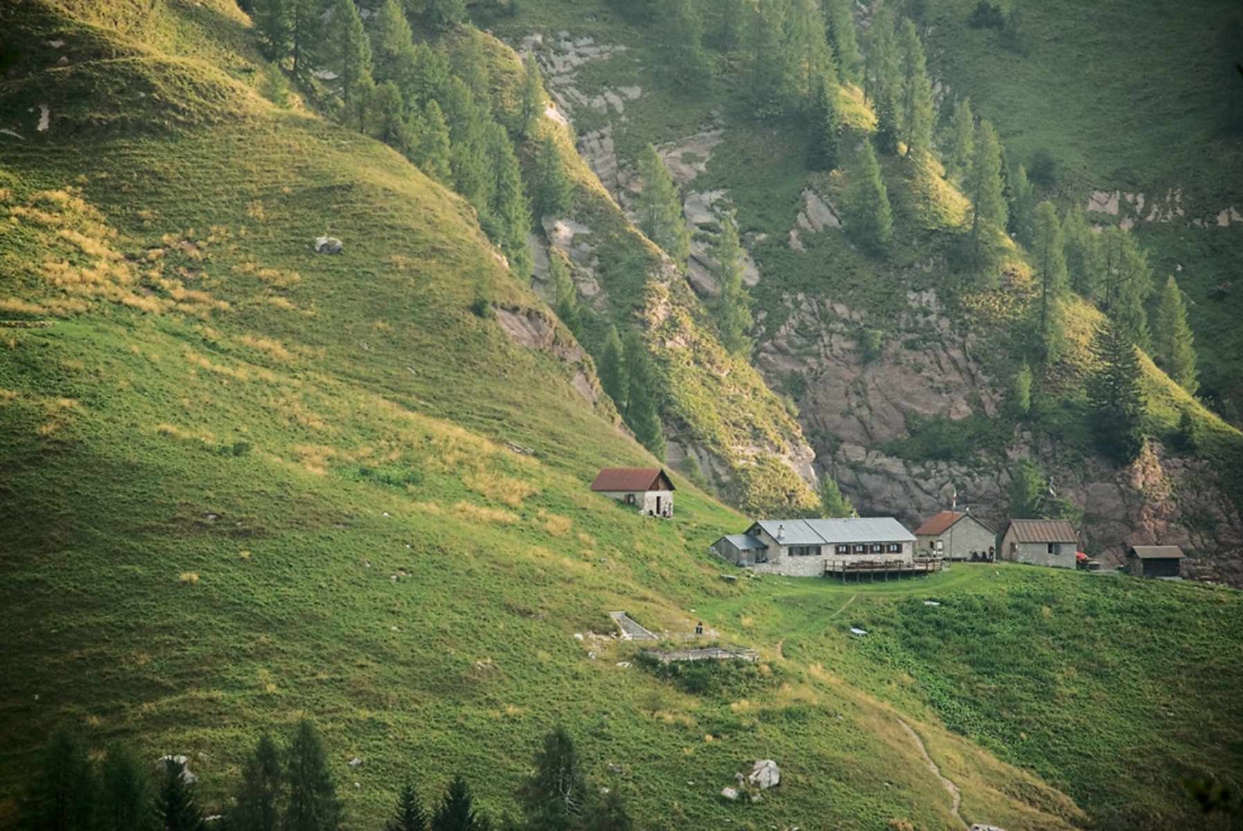 Die finale Querung hat es noch einmal in sich und erfordert zum Abschluss der Etappe Konzentration. Mit fast 800 m Abstieg ab der Scharte in den Knien stehen wir vor dem familiären Rifugio Pian de Fontana (1.632 m). Die ehemalige Senner-Alm mit den kleinen Hütten wurde 1996 als Unterkunft eröffnet und ist in manchen Karten als „Bivacco Renzo dal Mas“ verzeichnet.