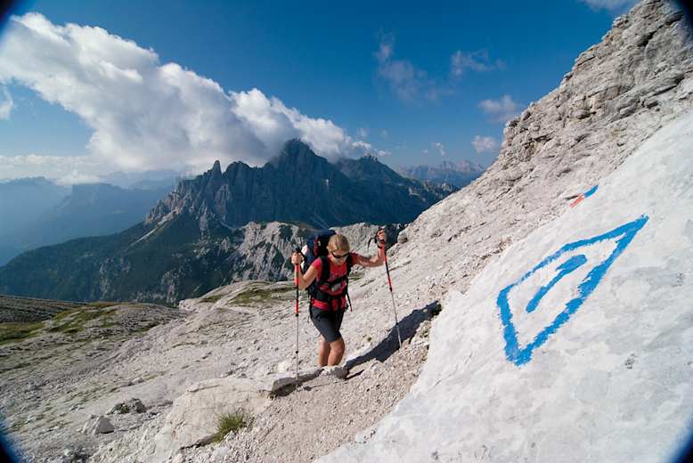 Das Dreieck ist Programm auf dem Dolomiten-Höhenweg 1, genauso wie atemberaubende Aussichten von Civetta bis Schiara. Foto: Dirk Steuerwald/Stephan Baur/Vera Biehl