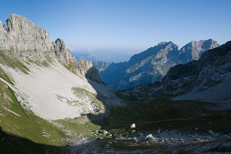 Auf dem jenseitigen Kamm steigen wir zunächst leicht nach links (NO) ab, dann dreht der Pfad nach rechts und verliert auf seinem Weg hinunter ins Van de Zita de Fora rasch an Höhe. Vor uns sehen wir dabei schon auf die Schiara-Gruppe, die sich jenseits des Tales erhebt. Wir bewegen uns hier in Gämsen-Gebiet – mit etwas Glück sehen wir sie gleich rudelweise.