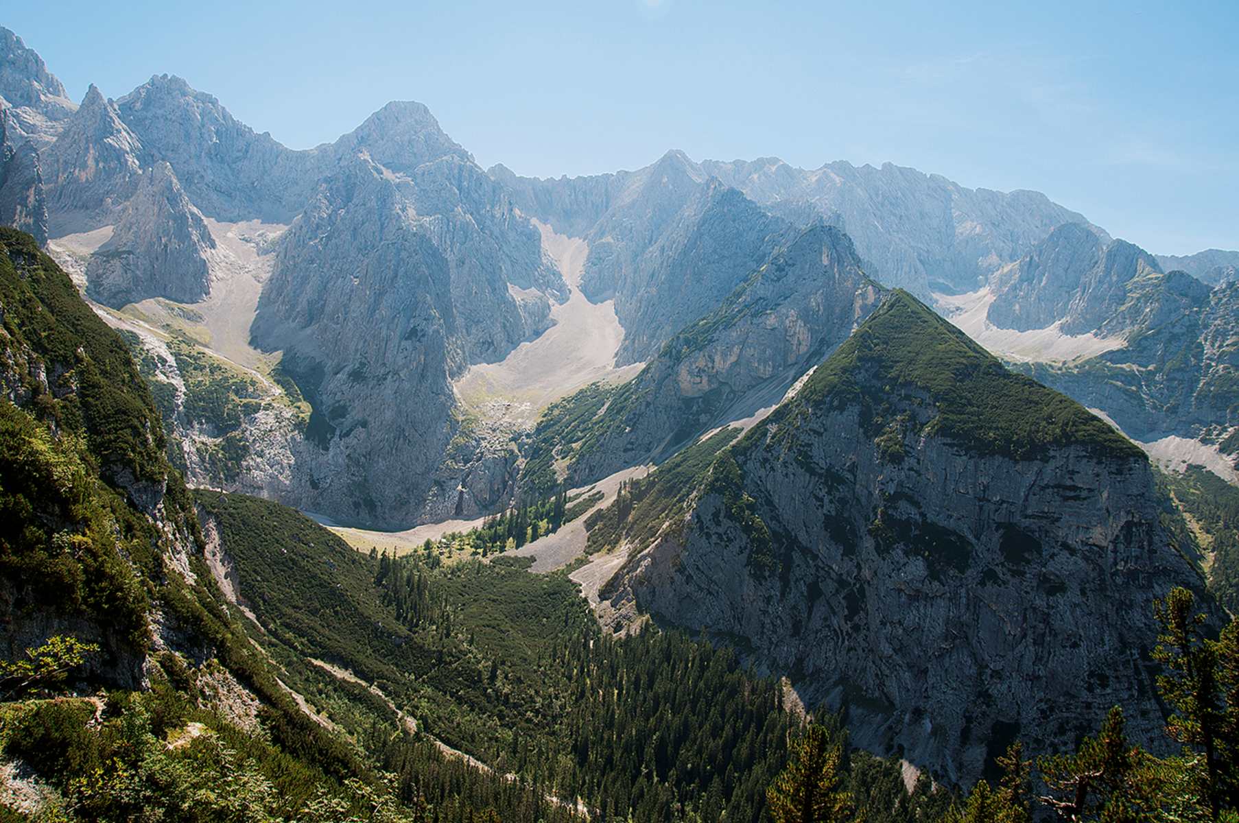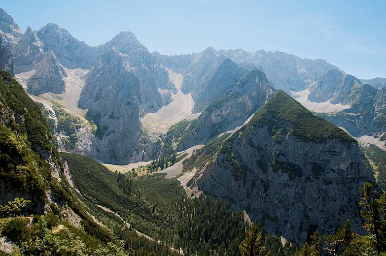 Wenig später empfängt uns der bisher spektakulärste Blick zum Hundsstallkar und ins hintere Wettersteingebirge. Der Große Hundsstall (rechts), der sich auf 900 Höhenmetern (!) von der Gras- und Waldzone über Schutt bis zu einem kleinen, sterbenden Gletscherchen/Eisfeld ganz rechts oben erstreckt, ist eines der abgeschiedensten und geheimnisvollsten Felskare des Wettersteins. Hier hielten sich früher höchstens Wilderer, Schmuggler oder besonders alpintaugliche Bergschafe auf.