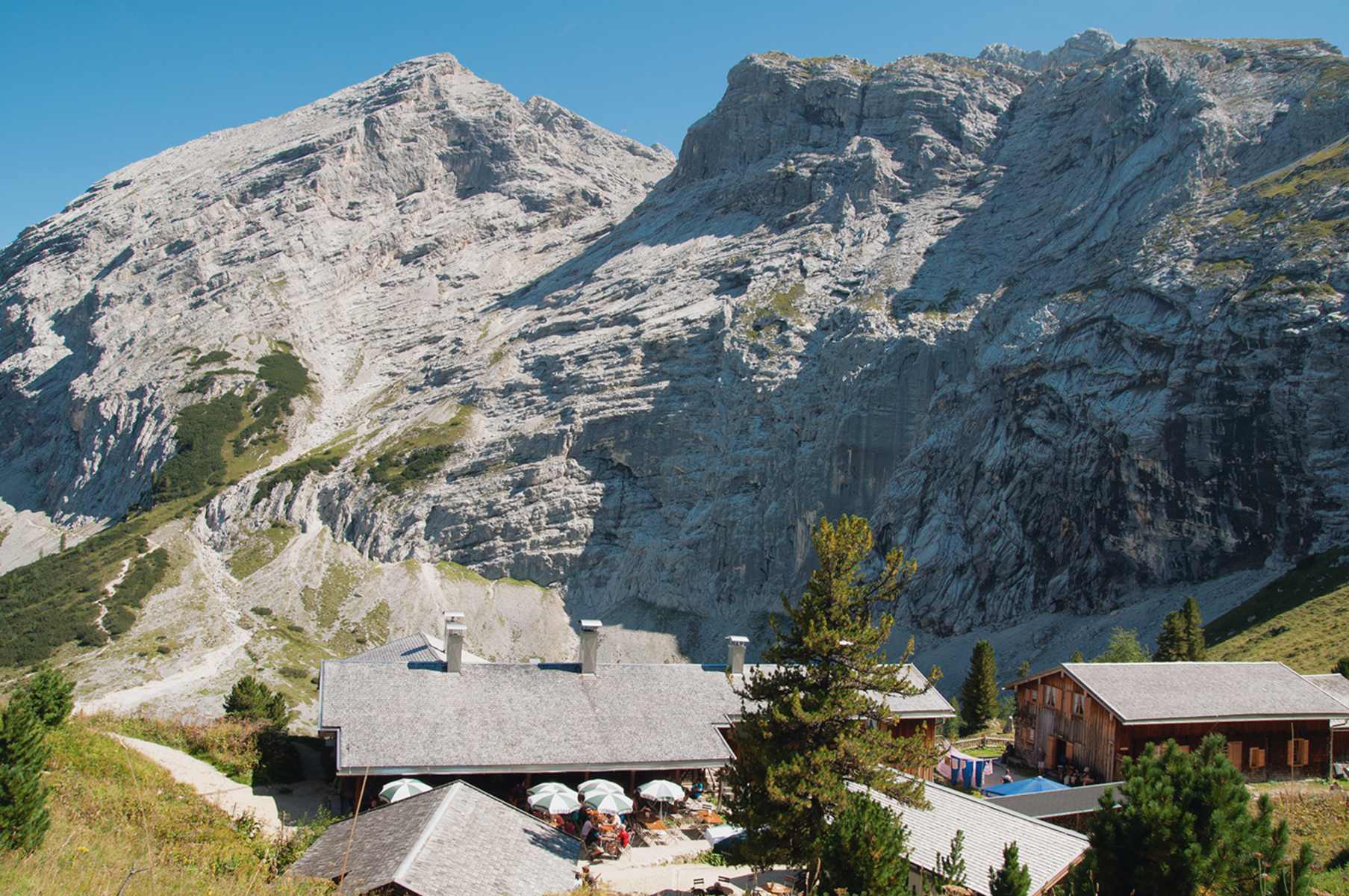 Zwischenstation an der Bockhütte: über der Partnach hinten das Zugspitzplatt. Foto: Christian Rauch Das »Gartentürl« zur Oberreintalhütte – links der Oberreintaldom, rechts der Untere Schüsselkarturm. Foto: Christian Rauch Vom Schachenweg aus gesehen: links Oberreintal mit Schüsselkartürmen, Oberreintalturm und dem trapezförmigen Oberreintalschrofen (hinten), rechts von ihm der Schmugglerübergang Oberreintalscharte mit Oberreintalkar, ganz rechts der Hundsstall. Foto: Christian Rauch Zur Tourmitte: Übernachtung in den einst königlichen Schachenhäusern, oberhalb das Gipfelziel des zweiten Tags. Foto: Christian Rauch Bildergalerie (4)