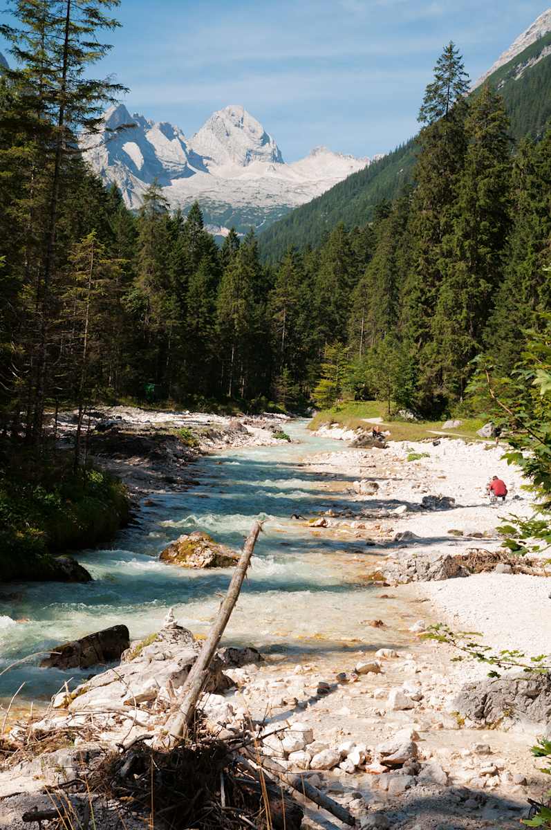 Im Wetterstein dominieren freilich Berge wie die Zugspitze und Alpspitze – doch das Herz des Gebirges, landschaftlich wie geschichtlich, ruht hinten im Reintal und Oberreintal. An unserem Ausgangspunkt, dem Parkplatz am Skistadion, aber sehen und ahnen wir von den Wetterstein-Geheimnissen noch wenig und folgen zuerst dem viel bevölkerten Weg Richtung Partnachklamm.