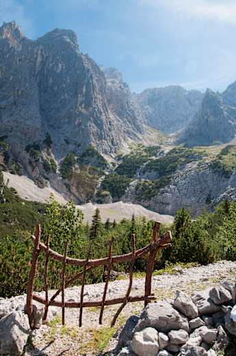 Für den Abstecher folgen wir dem Steig durch herrlichen, lichten Bergmischwald und über Geröll knappe 100 Höhenmeter bergauf, bis wir das Oberreintal-Gartentürl erreichen. Das kunstvoll aus Latschenästen gezimmerte Türl wurde 1984 aufgestellt, als der beliebte Hüttenwirt und Buchautor Charly Wehrle seinen fünf Jahre dauernden Aufenthalt im Oberreintal beendete; das Türl wurde in der Zwischenzeit erneuert.