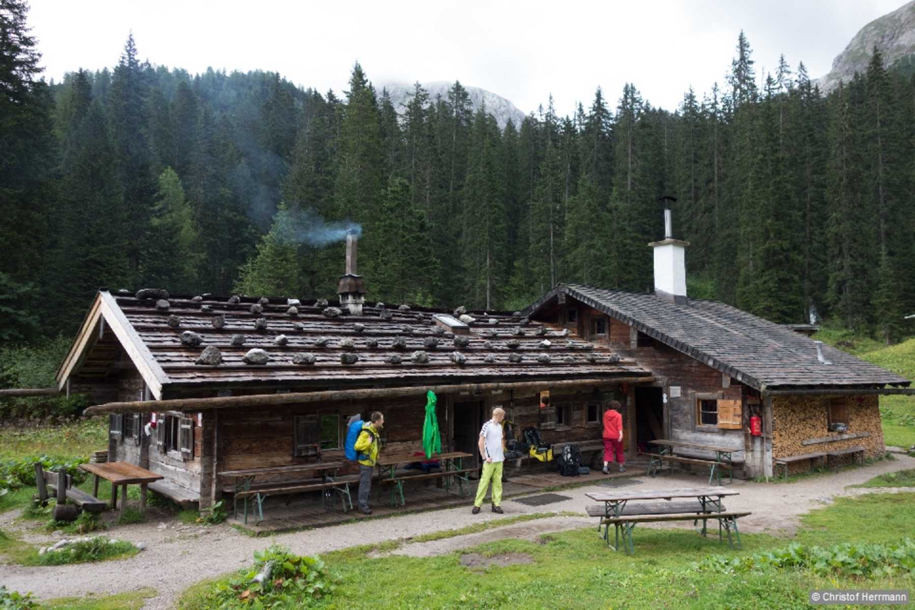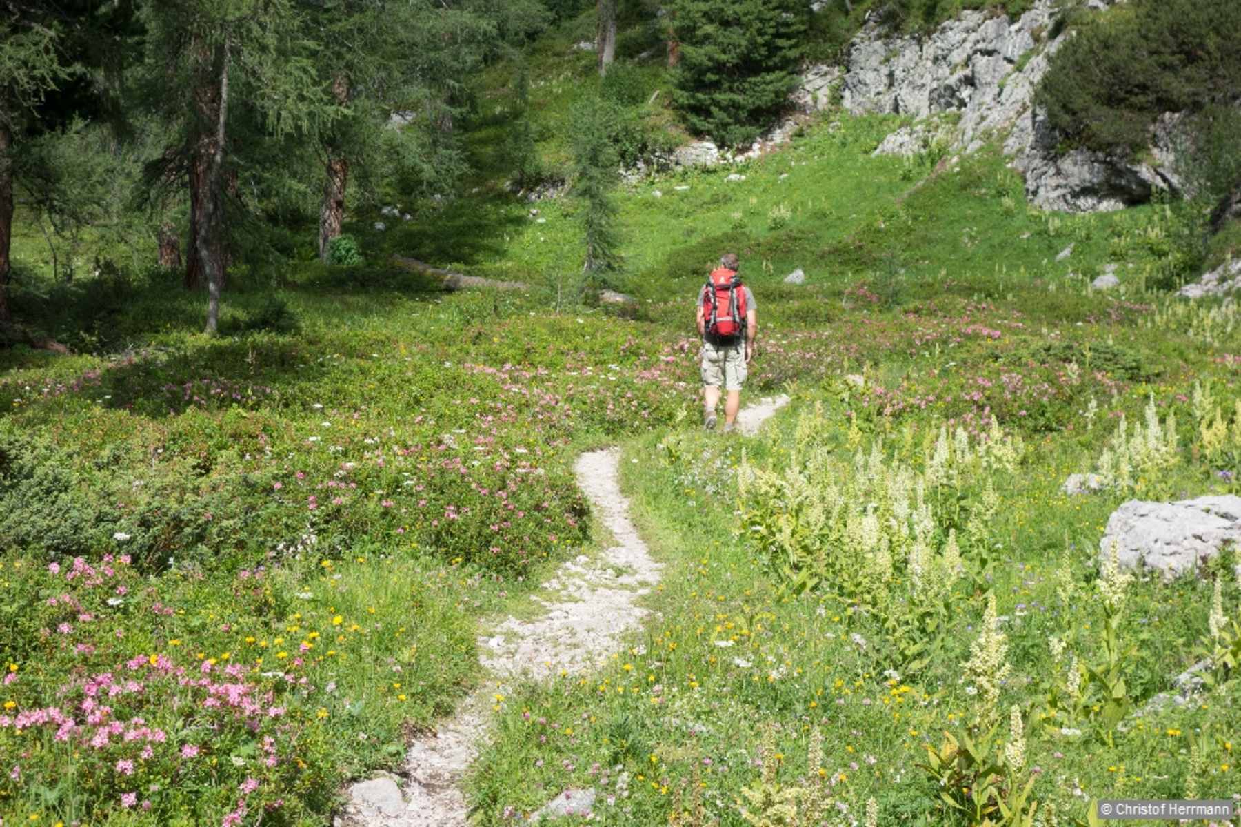 Wer die Abkürzung zum Riemannhaus nehmen möchte (siehe „Variante“), wählt Weg 413. Auf der Hauptroute kehren wir vom Kärlingerhaus auf dem Hinweg 200 m zurück bis zu einer Abzweigung. An dieser biegen wir links auf Weg 420 ab, der uns durch fast schon liebliche Landschaft mit Wiesen, Latschenfeldern und Baumbewuchs hinauf zum Hirschentörl, 1.876 m, bringt. Von hier überblicken wir die eher entrückte Steinwüste der Karsthochfläche, und auch das Ingolstädter Haus ist bereits in Sicht. Weg 412 führt links Richtung Peter-Wiechenthaler-Hütte. Wir gehen auf Weg 420 geradeaus weiter und passieren bald die verfallene Schönbichlalm, 1.805 m.
