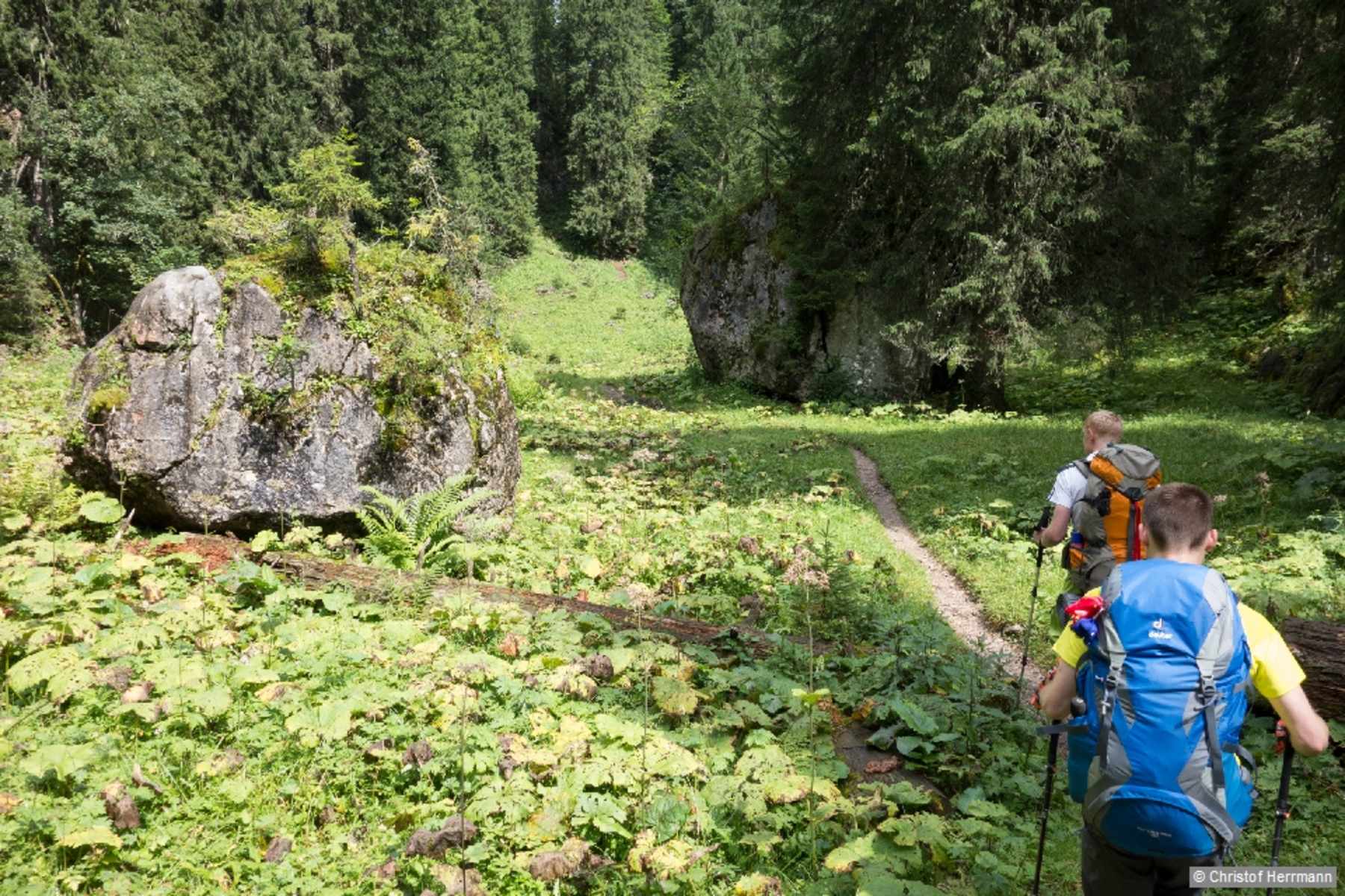 Nach den beiden Karstseen steigen wir durch den Wald auf wenig vertrauenerweckenden Holztreppen und Stufen steil auf. Vor allem bei Nässe ist hier Vorsicht geboten. Immer wieder überrascht die vielfältige Fauna und der dschungelartige Bewuchs. Wir treffen auf den Weg, der vom Königssee durch die Saugasse heraufführt. Hier geht es links weiter. Über den Funtenseesattel, 1.672 m, gelangen wir rasch hinab zum Kärlingerhaus, 1.630 m, und zum malerischen Funtensee, 1.601 m.