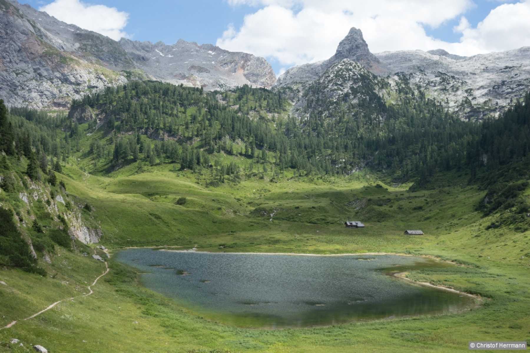 Teuflisches Gurgeln im Steinernen Meer: Heute wandern wir durch das Steinerne Meer. Es ist mit einer Fläche von rund 160 km² der größte der neun Gebirgsstöcke der Berchtesgadener Alpen und nach dem Untersberg und dem Hagengebirge der dritte, den wir durchqueren. Das Karsthochplateau ist mal karg, mal mit üppiger Bergwaldvegetation bewachsen. Für Abwechslung sorgen zum Beispiel die fünf Bergseen. Auf den Königssee und den Obersee blicken wir über 1.000 Hm hinab. Den Karstseen Schwarzensee, Grünsee und Funtensee kommen wir so nahe, dass wir die geschwollenen Füße ins Bergwasser halten können. Wer sich traut, nimmt ein erfrischendes Bad. Noch Mutigere können am Funtensee nach dem Gurgeln suchen. Das Geräusch soll vom Teufel stammen, der tief unten Steine zu Silbertalern mahlt, um damit Seelen zu fangen. Knapp davongekommen, fällt der Weiterweg leicht. Kurz vor dem Tagesziel überqueren wir die Grenze. Die nächsten elf Tage wandeln wir auf österreichischem Boden.