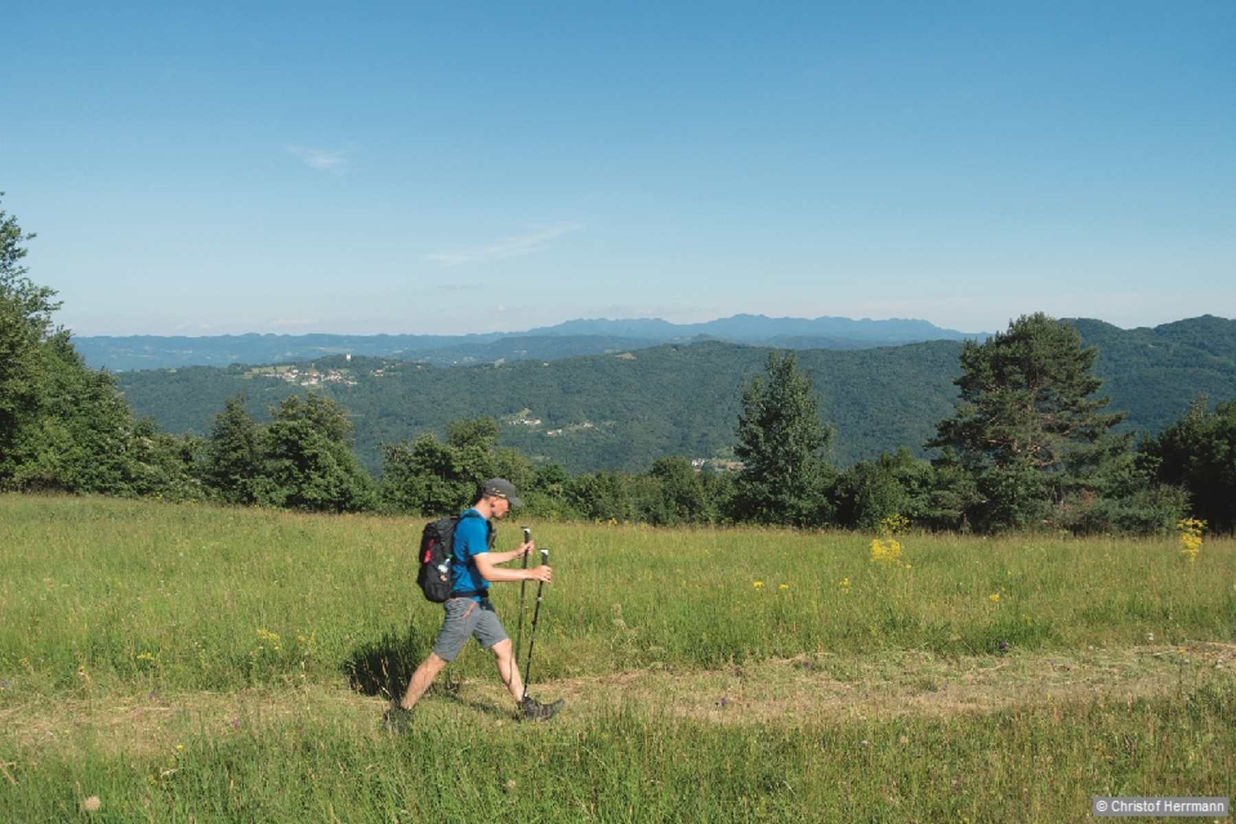 In Tribil Superiore, 642 m, kehren wir zunächst zum Ortsrand zurück. Dort zweigt unsere Route auf einem bereits markierten Forstweg halb rechts ab. Foto: Christof Herrmann, Rother Bergverlag Wald, Wiesen und Blicke in die Weite. Foto: Christof Herrmann, Rother Bergverlag Neugierige Ziegen freuen sich über Streicheleinheiten. Foto: Christof Herrmann, Rother Bergverlag Wir halten uns weiter an die Markierungen des Wegs 747 und des Alpe Adria Trails und gelangen zur Kirche San Giovanni, 702 m. Von hier hat man abermals einen schönen Blick hinüber nach Slowenien und zurück zu den Julischen Alpen. Foto: Christof Herrmann, Rother Bergverlag Wehrhaft auf einer einsamen Anhöhe gelegen zählt Castelmonte zu den ältesten und bedeutendsten Wallfahrtsorten Oberitaliens. Urkundlich belegt ist ein Marienheiligtum bereits seit 1175. Das Ziel ist eine Madonnenstatue, die hier am 8. September 1479 aufgestellt wurde (die eigentliche Wallfahrt findet jedes Jahr an diesem Septembertag statt). Foto: Christof Herrmann, Rother Bergverlag Die sitzende Madonna mit Kind ist im weichen Stil der Spätgotik gearbeitet und wird für ihre Schönheit gelobt (»Madonna bella«), auch wenn sich Kunsthistoriker an den später angebrachten Kronen stören. Der Kirchenbau wurde im 16. und 17. Jahrhundert errichtet und später mehrfach verändert. Volkskundlich interessant sind die zahlreichen Votivbilder in der Kirche und Krypta, die dankbare Pilger im Laufe der Jahrhunderte hinterlassen haben und an Gefahrensituationen erinnern. Seit 1913 ist das Kloster Castelmo Foto: Christof Herrmann, Rother Bergverlag Abends haben wir das Kapuzinerkloster fast für uns allein. Der Besuch einer der Pilgermessen lohnt sich, auch wenn man kein Italienisch versteht. Sie finden während der Sommerzeit an Sonn- und Feiertagen um 8, 9, 10, 11.30, 16, 17 und 18 Uhr und an den übrigen Tagen um 9, 10, 11 und 17 Uhr statt; außerhalb der Sommerzeit an Sonn- und Feiertagen um 8, 9, 10, 11.30, 15.30 und 17 Uhr und an den übrigen Tagen um 9, 10, 11 und 16 Uhr. Weitere Infos über das Santuario Beata Vergine di Castelmonte, die Wallfahrtsk Foto: Christof Herrmann, Rother Bergverlag Immer wieder öffnen sich Ausblicke auf die bewaldete Hügellandschaft und entlegene Bergdörfer. Foto: Christof Herrmann, Rother Bergverlag Bildergalerie (8)