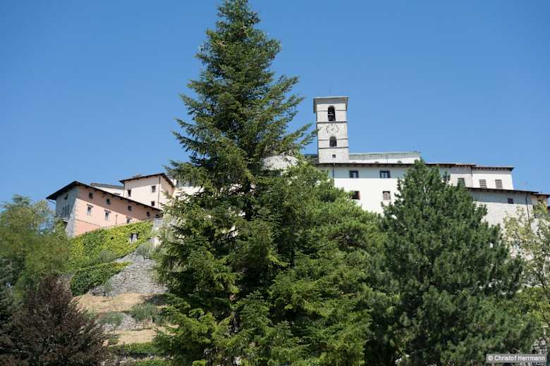 Dort geht es links am Waldrand bergan weiter. 1,5 km nach der Kirche kommen wir an eine Straße, der wir 50 m nach rechts folgen. Wer zur Locanda al Trivio möchte (siehe »Einkehr« und „Unterkunft“), bleibt auf der Straße. Die Hauptroute biegt links auf einen Pfad ab. In einem weiten Linksbogen steigen wir steil 200 Hm hinab. Dann müssen wir uns scharf rechts halten. Nach einem ähnlich steilen Anstieg sind wir am Tagesziel, dem Wallfahrtsort Castelmonte, 618 m. Durch ein großes Steintor betreten wir das Kloster.