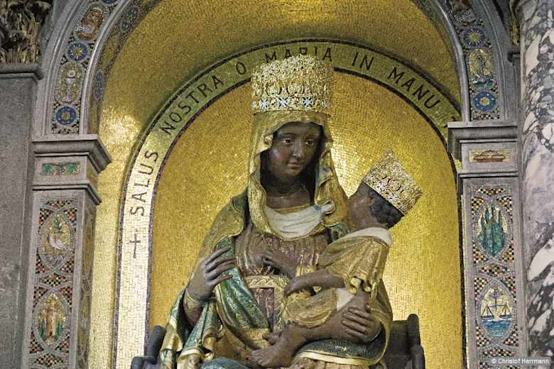 Die sitzende Madonna mit Kind ist im weichen Stil der Spätgotik gearbeitet und wird für ihre Schönheit gelobt (»Madonna bella«), auch wenn sich Kunsthistoriker an den später angebrachten Kronen stören. Der Kirchenbau wurde im 16. und 17. Jahrhundert errichtet und später mehrfach verändert. Volkskundlich interessant sind die zahlreichen Votivbilder in der Kirche und Krypta, die dankbare Pilger im Laufe der Jahrhunderte hinterlassen haben und an Gefahrensituationen erinnern. Seit 1913 ist das Kloster Castelmo Foto: Christof Herrmann, Rother Bergverlag