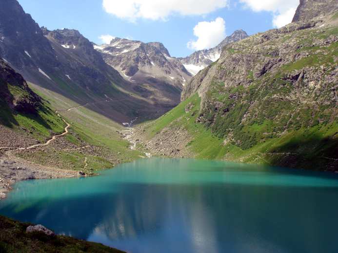 Am Ende des Kartellsees biegt man rechts auf den Weg zur Darmstädter Hütte ein. Nach der Hütte geht es weiter auf dem Apothekerweg hinauf zum Kuchenjöchli. Von hier aus über steile Serpentinen stetig bergab bis zur Konstanzer Hütte.