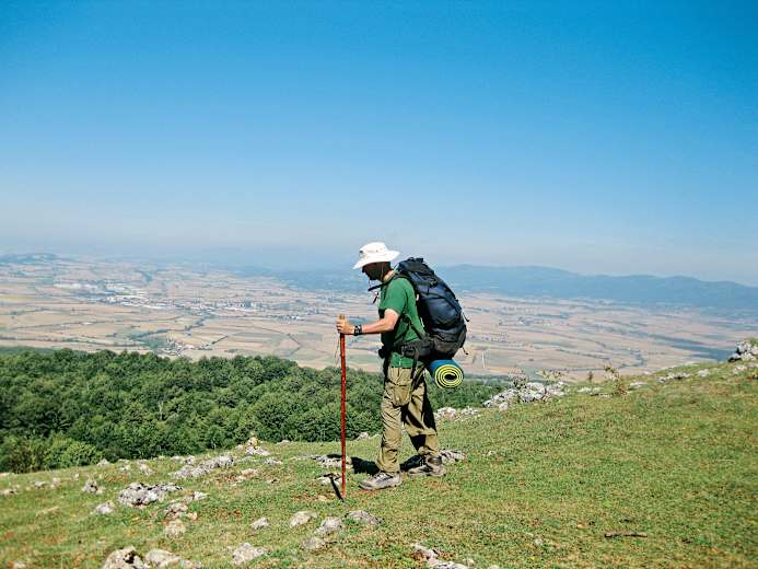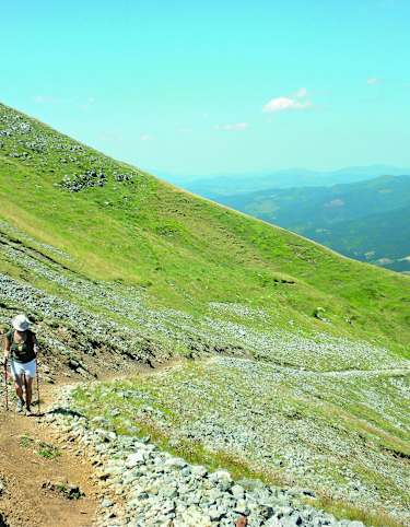 Die rot-weißen Markierungen auf Steinen und an Bäumen geben uns Sicherheit, die Bäume am Wegrand spenden Schatten und unser Blick geht über die Berge am Horizont. Es ist wichtig, dass wir genügend Trinkwasser mitführen und bei Regen oder nassen Wegen (Schlamm!) vorsichtig sind. Bei Schnee sollte man den Weg nicht machen und wie die Radfahrer auf die Straßen ausweichen.