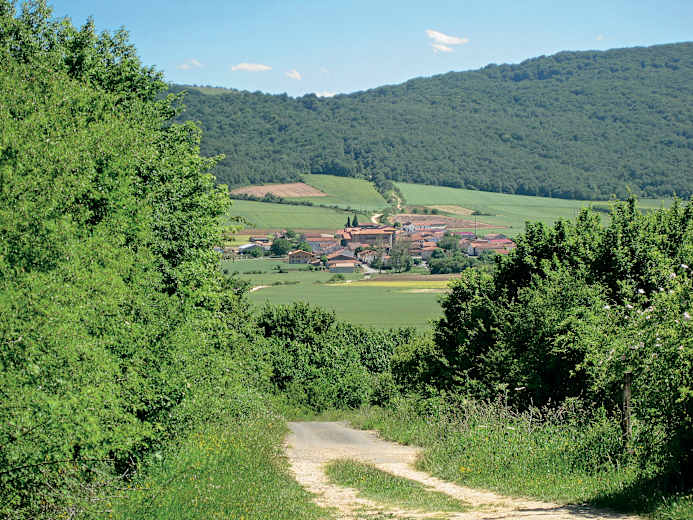 Hier nehmen wir den Weg, der links beginnt. Auf ihm entfernen wir uns von der Landstraße, immer geradeaus und in etwas weniger als 2 km sind wir am Puerto Nuevo (1048 m). Knapp 17 km haben wir auf der heutigen Etappe nun schon zurückgelegt, jetzt geht es rund vier Kilometer abwärts nach Alda. Am Puerto Nuevo angekommen, müssen wir sehr aufmerksam sein: Es gibt weder Wegweiser noch Markierungen. Wir sollten auf den Punkt achten, wo der Weg eine scharfe Linkskurve macht. Dort verlassen wir die Straße nach rechts und gehen direkt in Richtung Arana-Tal auf einem Weg, der direkt vor uns nach unten führt. Ein Viehgatter und weiß-gelbe Markierungen helfen uns, den Weg zu finden. Nach 1,2 km erreichen wir landwirtschaftlich genutzte Felder und einen Stausee, den wir rechts von uns liegenlassen. Immer geradeaus und ohne abzubiegen kommen wir in die Ortschaft Ullíbarri. Am Ortseingang sehen wir links die Einsiedelei Santa María de Andramari. Wir gehen durch das Dorf und kommen an der Kirche vorbei. Am Ende der Calle Mayor befindet sich die Kapelle San Cristóbal. Hier gabelt sich die Straße und wir gehen rechts direkt nach Alda, unserem heutigen Ziel.