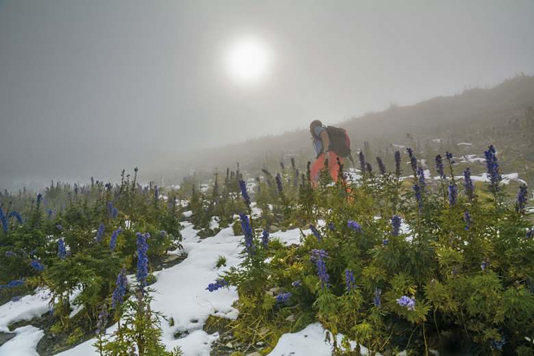 Vom Druesberg steigt man auf gleicher Route wieder hinab zur Druesberglücke. Nun führt der Weg in die nordseitige Flanke des Forstbergs. Über eine gesicherte Kraxelstelle geht es schließlich – die letzten Meter durch regelrechte Felder aus blauem Eisenhut – bis auf den höchsten Punkt des Forstbergs.