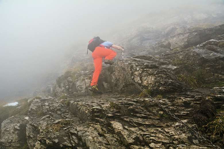 Der anfangs einfache Abstieg führt zunächst über den Nordwestgrat, macht aber schon bald einen Knick nach links, um zu P.2026 zu leiten. Der folgende felsige Gratabschnitt wird nordseitig umgangen. Dabei sind längere kettengesicherte Passagen zu bewältigen, die bei Nässe oder gar Vereisung schnell unangenehm werden können (aufgrund der nordseitigen Exposition nicht so selten).
