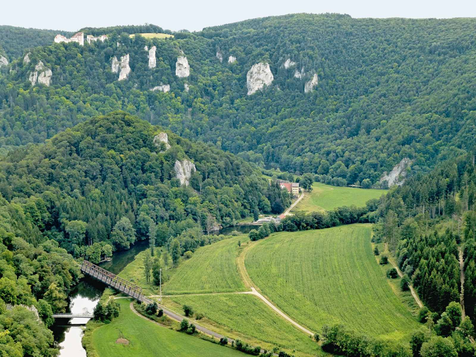 Nach dem Einquartieren spricht nichts dagegen, in der Abendsonne mit einem frisch gezapften Bier zum 100 m entfernten Aussichtspunkt Rauher Stein zu schlendern und entspannt die ersten herrlichen Blicke ins Donautal zu genießen.