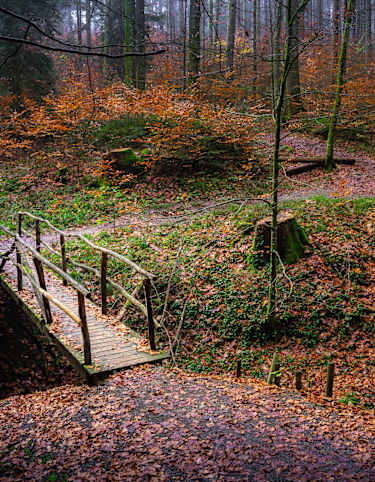Unterhalb des Klosters befindet sich der Parkplatz. Von dort laufen wir zur historischen Holzbrücke, überqueren diese und halten uns vor der L277 links. Wir folgen nun ca. 2 km der „roten Gabel“ , dann geht es nach rechts ab, kurz steil den Berg hinauf. Wir treffen auf die L277 und halten uns rechts. Beim alten Soldatenfriedhof überqueren wir die Straße und folgen dem Weg gegenüber leicht bergan. Nach knapp 1 km treffen wir wieder auf die L277 und die darin einmündende K8277. Hier queren wir die Straßen und wandern dann nach links wenige Meter entlang der Landesstraße auf dem Gehweg. An der Bushaltestelle „Kohlplatte" weist uns das Wegzeichen „gelbe Raute“ nach rechts.