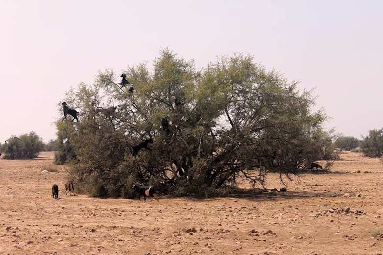 Was haben die Ziegen auf den Bäumen mit dem heiß begehrten Argan-Öl zu tun? Die Ziegen „pflücken" in den stacheligen Arganien (von der UNESCO geschützt) die Früchte, deren Kerne unverdaut von der Ziege ausgeschieden und von den Menschen gesammelt werden. Seit Jahrhunderten stellen die Berber im Süden Marokkos das begehrte Arganöl her. Das aromatische Argan-Öl, dessen gesundheitsfördernde Wirkungsweise durch wissenschaftliche Forschungsarbeiten in Europa belegt wird, wird in staatlich geförderten Frauengenossenschaften hergestellt. Im Zentrum von Tioute kann man eine derartige Kooperative besuchen.
