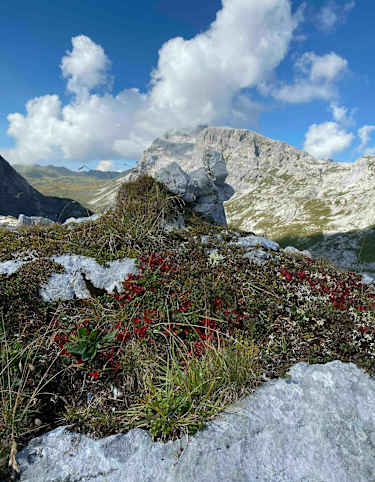 Dorthin wandelt sich der Charakter der Wanderung grundlegend. Anhand einer blau-weißen Markierung nähert man sich über Gras-Latschen-Gelände dem markanten Felssporn, wo auf gut 2.100 Meter Höhe der in Abständen immer wieder gesicherte Leibersteig ansetzt. Geschickt, wenngleich mitunter exponiert leitet die Route im Hin und Her höher und zieht dann stets schräg ansteigend über Schutt- und Felsbänder (Vorsicht bei Restschnee) gegen die abschließenden Wände hinan.