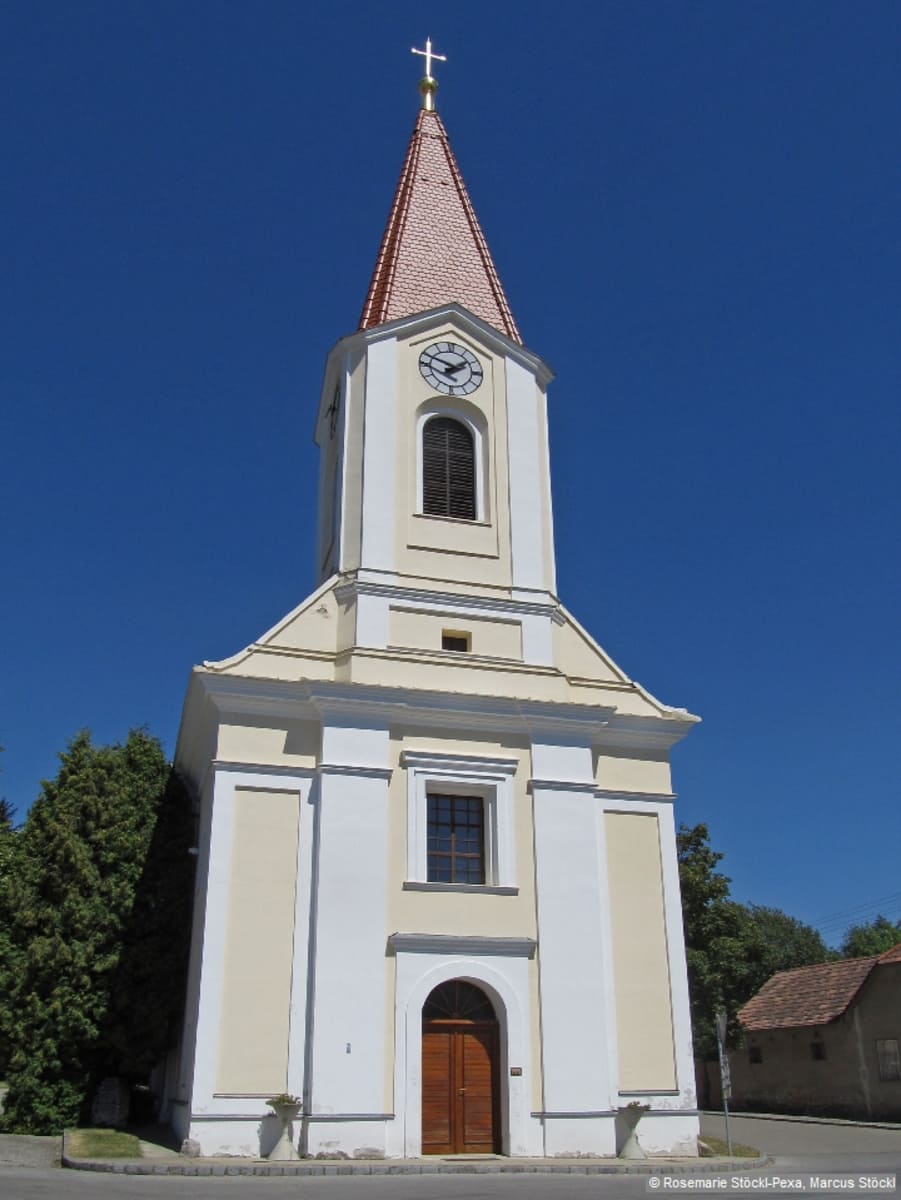 Der Jakobswegweiser weist nach knapp 1 km auf diesem Weg nach rechts durch den schmalen Rollerweg hinüber zum Hauptplatz; wir verlassen hier kurz den offiziellen Weg für einen Abstecher zu unserem Etappenziel, der Pfarrkirche: Wenige Meter weiter gehen wir links durch die Bruderhofgasse und steigen über Stufen auf den Kirchenberg hinauf, wo sich die schon weithin sichtbare Pfarrkirche von Mistelbach befindet (1¾ Std. / 6,2 km).