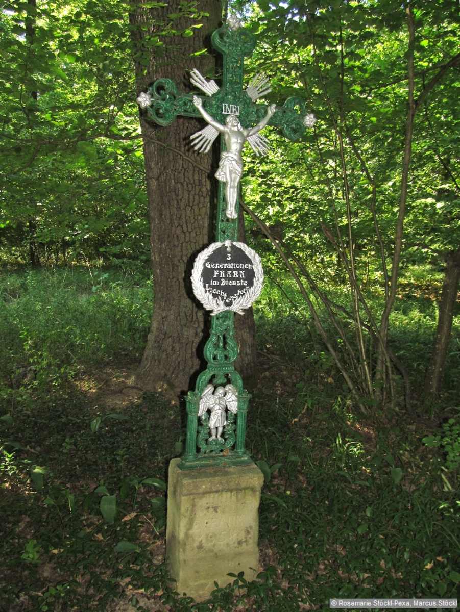 Im Wald kommen wir an einen breiten Schotterweg, auf dem wir dem Wegweiser nach rechts auf einer rot-weiß-roten Markierung Richtung Mistelbach folgen. Nach 500 m, am Beginn einer Lichtung, schräg links, kommen wir zum Frankkreuz und gleich dahinter zu einer Gabelung, bei der es wieder Wegweiser des Jakobsweges und des Weges 634 gibt. Wir gehen nun leicht bergab; in Hörweite einer Straße weist uns die Markierung auf einen schmalen, zum Teil überwachsenen Waldweg. Dieser trifft auf eine Schotterstraße, auf der wir rechts gehen. An der nächsten Gabelung halten wir uns links und kommen nach 60 m zu einer Jagdhütte, vor der wir links gehen.