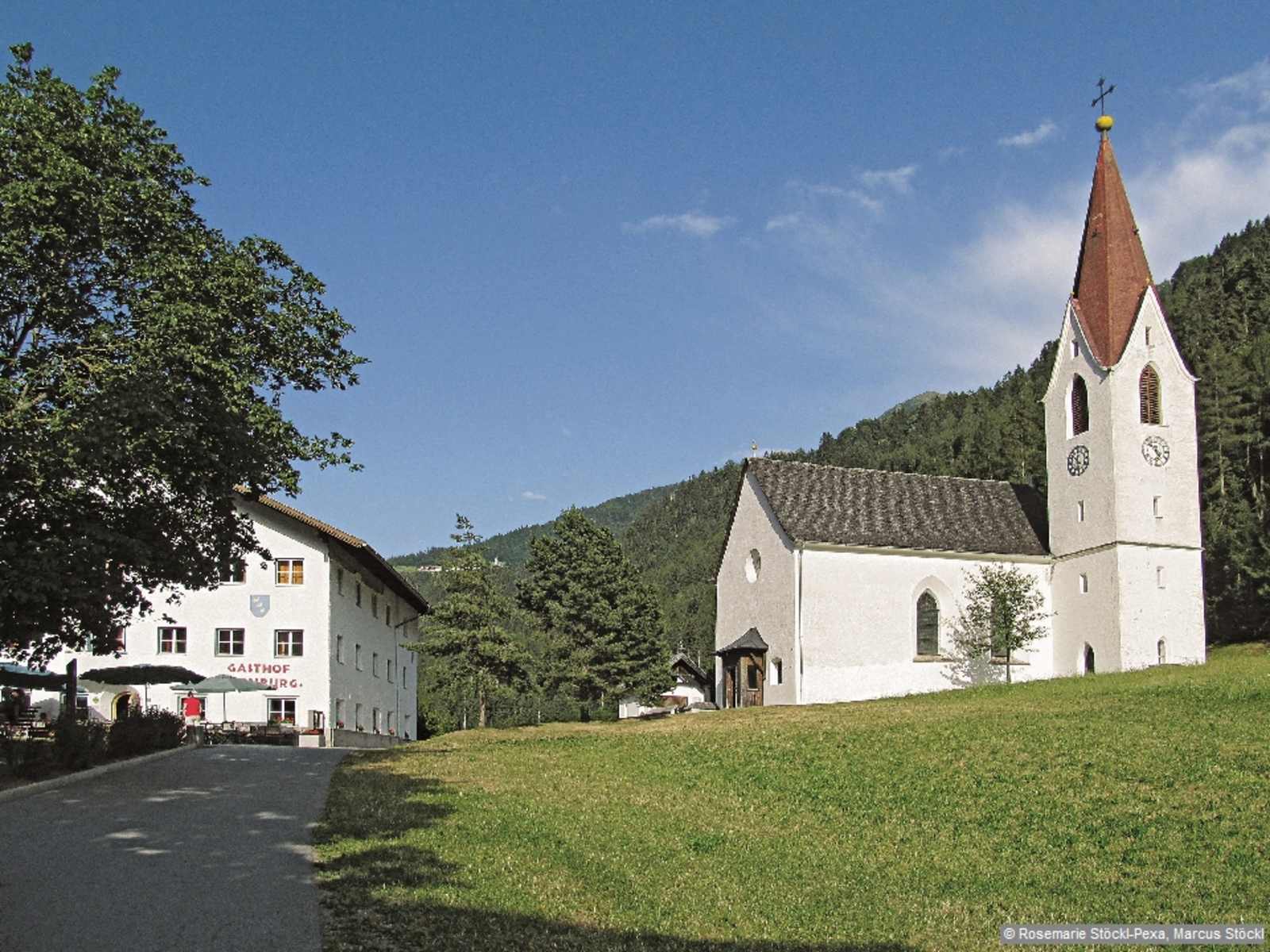Von der Bahnhaltestelle Roppen wandern wir auf einer schmalen Asphaltstraße links der Bahngleise hinauf in den Ort Obbruck. Foto: Rosemarie Stöckl-Pexa, Marcus Stöckl, Rother Bergverlag Nach links geht es in den Ort, den Wegweisern folgend, über einen kleinen Fußweg zum Gasthof Alpenrose direkt bei der Bahnhaltestelle Imsterberg. Foto: Rosemarie Stöckl-Pexa, Marcus Stöckl, Rother Bergverlag Die Kirche St. Vigil in Obsaurs gehört zu den Höhepunkten der Etappe. Foto: Rosemarie Stöckl-Pexa, Marcus Stöckl, Rother Bergverlag Blick in die Kronburger Schlucht. Foto: Rosemarie Stöckl-Pexa, Marcus Stöckl, Rother Bergverlag Das alte Hospiz von Kronburg ist heute ein Gasthof. Foto: Rosemarie Stöckl-Pexa, Marcus Stöckl, Rother Bergverlag Bildergalerie (5)