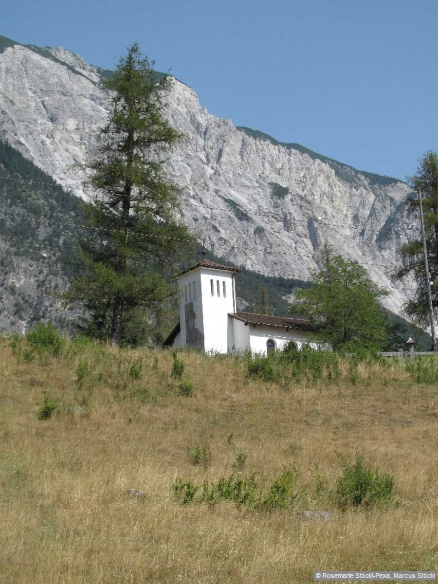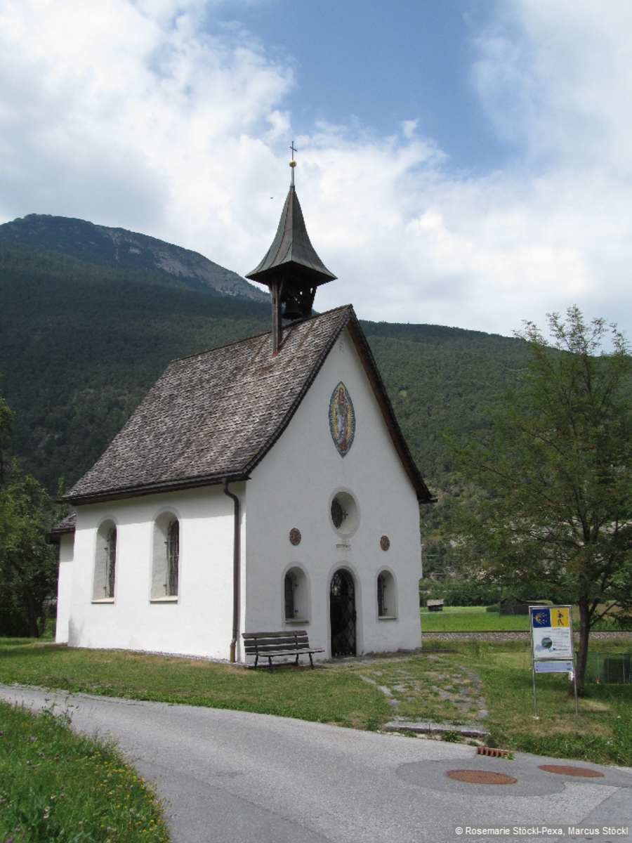 Hinter diesem links auf der alten Pitztalstraße (die neue führt hoch über uns über eine Brücke) bergauf. In einer Linkskurve rechts auf eine Forststraße Richtung Imsterau, die zunächst hoch über dem Tal durch den Wald und dann wieder bergab verläuft. Zunächst queren wir den Abfluss des Kraftwerks Imst, dann umgehen wir das Umspannwerk. Vor einem Viehrost wenden wir uns nach links auf einen Fußweg, der erst parallel zur Asphaltstraße, dann hinter den Hausgärten vorbei nach Imsterau führt. Wir passieren einen Fischteich, dann treffen wir wieder auf Asphalt. Nach links geht es in den Ort, den Wegweisern folgend, über einen kleinen Fußweg zum Gasthof Alpenrose direkt bei der Bahnhaltestelle Imsterberg. Danach auf einem Fahrweg neben der Bahn weiter. Dieser wird zum Fußpfad, steigt in den Wald hinein an und führt wieder an einer Kapelle vorbei. Am Ortsanfang des Weilers Ried gehen wir links hinauf, dann am Waldrand rechts. Bei einer Kreuzung zieht ein (anfangs sehr steiler) Fußpfad links den Hang hinauf. Wir folgen ihm (bei Nässe sehr rutschig!) hinauf zur uralten, idyllisch gelegenen Kirche St. Vigil in Obsaurs (2½ Std. / 9 km; Pilgerstempel, Trinkwasser).
