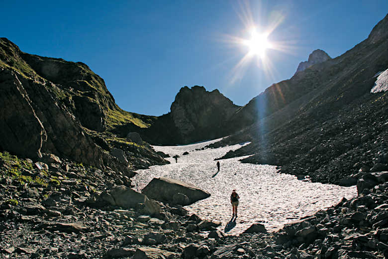 Jenseits führt der Weg zunächst durch die blumenreichen Wiesen der Rauchkofelhänge bergab bis in den Boden des Valentinkars, das hier ziemlich flach und häufig schneebedeckt ist. Auf dem Schnee kommen wir schnell tiefer, wir erreichen eine Hangkante und sehen hinunter zu den Almwiesen der Oberen Valentinalm.