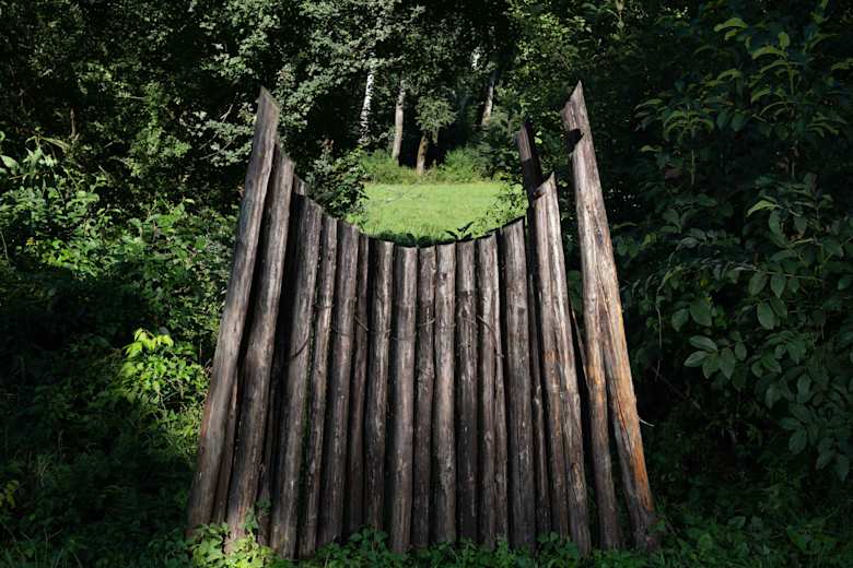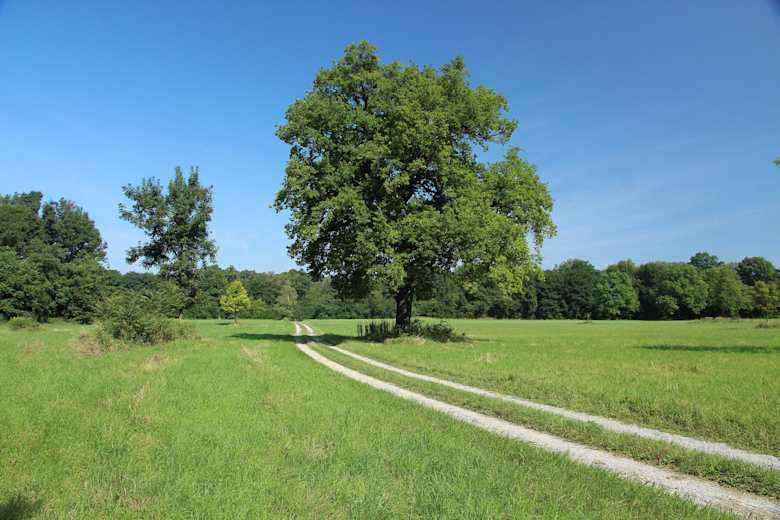 Im spitzen Winkel führt die Route nach Norden zurück, immer noch über Wiesen, später durch den kühlen Auwald. Es lohnt sich, die Blicke kreisen zu lassen, da sich im Wald allerlei Installationen aus Naturmaterialien verbergen. Erneut passiert man den Damm und schließt, vorbei an einer großen Weidefläche, den Rundweg beim Schlosspark.