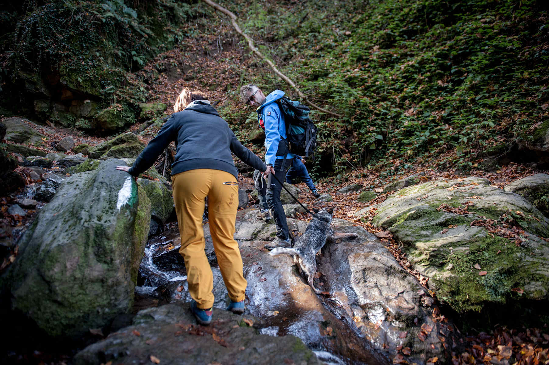 Am Weg zum Start der Wanderung passiert man ein „Wander-Denkmal“, welches wohl eher für die ausgetretenen Latschen so mancher Wanderfreunde gedacht ist. Kurz danach zweigt der Steig in die Klamm ab. Durch dichten Wald folgt man dem Bach bergauf. Zahlreiche Querungen und Steilstufen machen den Weg je nach Witterung ganz schön anspruchsvoll. Für die Kleineren empfiehlt es sich, eine trockene Wäschegarnitur mitzunehmen.