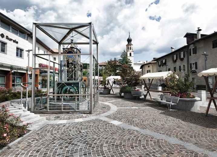 Dort wendet man sich nach rechts (Wegschild Smarano, Tres – SF) und wandert fast eben weiter bis zu einem Campingplatz auf der rechten Seite (Örtlichkeit Merlonge, 1.030 m – Schild auf der linken Seite). Man geht geradeaus weiter und trifft gleich schon auf ein Wegschild (Smarano, Tres – SF). Kurz weiter bis zur Teerstraße. Man überquert die Straße und geht geradeaus weiter (Markierung rot-weiß) zwischen den Villen hindurch. Der Weg führt zur Feuerwehrhalle von Smarano (970 m). Es gibt wieder Wegschilder (Tres, Vervò – SF). Man überquert die Straße und geht beim großen Betonkreuz geradeaus abwärts (schlechte Markierung/nur rot-weiß) bis zur Kreuzung mit der Hauptstraße (Wegschild Tres, Vervò – SF). Man quert die Hauptstraße und folgt der Straße auf der gegenüberliegenden Seite (schlechte Markierung) Richtung Ortskern und Kirche Smarano. Man geht kurz abwärts, bis man rechts einen interessanten Brunnen (mehrere Schalen) und einen Parkplatz sieht.