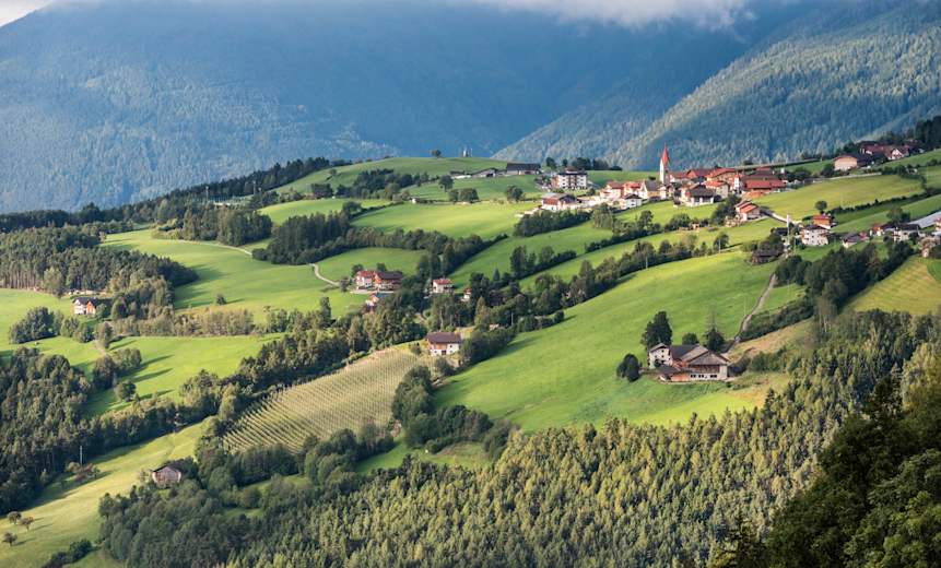Die Aussicht reicht von den Sextener Dolomiten in die Puez-Geisler-Gruppe bis hin zum Schlern, dem Symbolberg Südtirols.