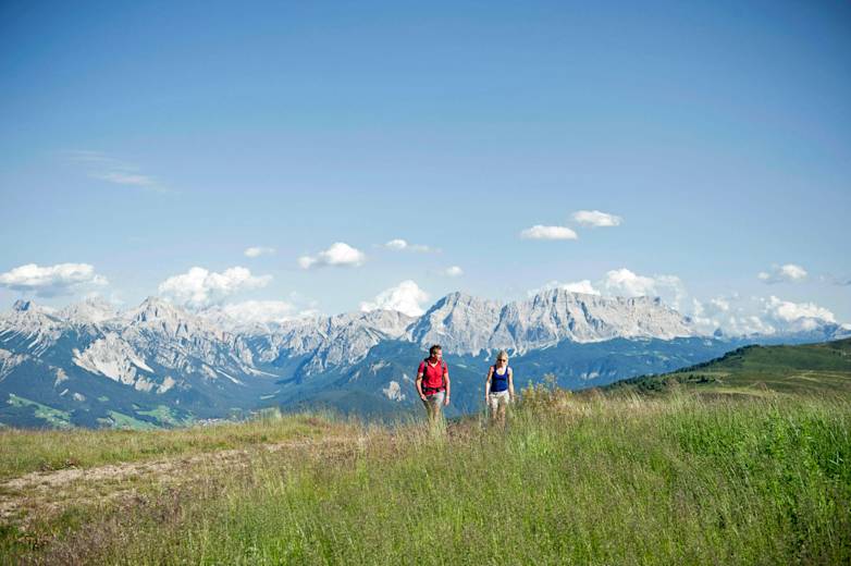 Die genussreiche Wanderung auf das Astjoch, auch Burgstall (2.194 m) genannt, führt zum östlichsten Punkt am der Rodenecker-Lüsner Alm. Dieser leicht erreichbare Aussichtsgipfel in den nordwestlichen Dolomiten wird von einem riesigen Holzkreuz geziert, das man schon von der Ferne sehen kann.