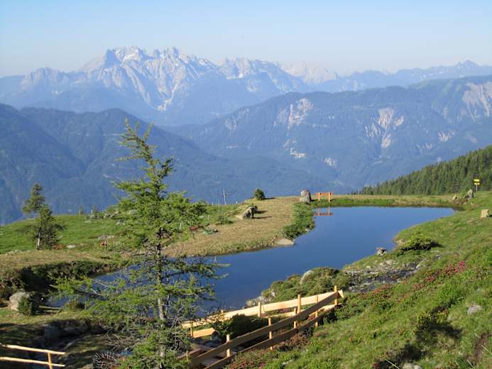 Ausgehend vom Parkplatz Leppner Alm führt der Wanderweg über die Almen oberhalb der Waldgrenze zum Knappensee. Hier wurde vor mehr als 300 Jahren Gold und Silber abgebaut. Ein herrlicher Panoramarastplatz erinnert heute an die goldenen Zeiten des kleinen Bergdorfes am Fuße des Scharniks. Rückweg über Ochsneralmhütte mit Einkehr.