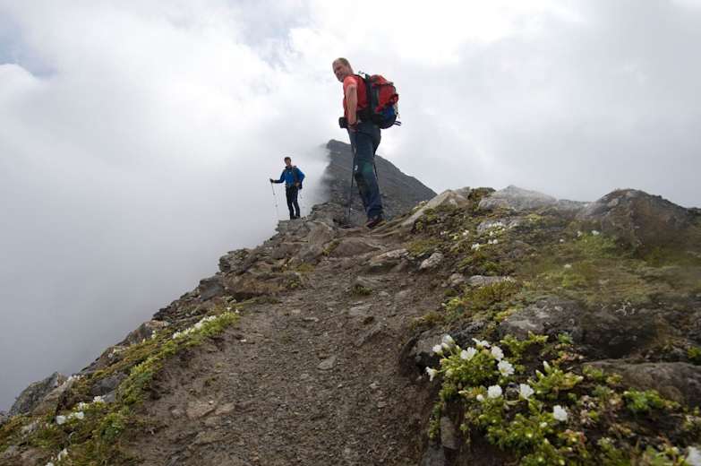 Vom Gipfel weiter am windgeschliffenen Nordostkamm bis kurz unter den Kloben. Südlich des Hauptkammes und am Rande des kleinen „Keeses“ bis in die Brennkogelscharte. Nun wieder direkt am Kamm und ab der Bretterscharte nordseitig zum Hochtor an der Glocknerstraße.