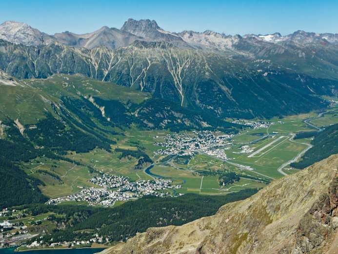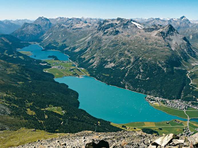 Einmalig ist der Ausblick zum gletscherbeladenen Hauptkamm der Berninagruppe, den man vom Piz Palü über den Piz Bernina bis hin zum Piz Glüschaint überblicken kann. Auch dürfte es schwer fallen, einen Standort zu finden, wo die aufgereihten Seen Lej da Segl und Lej da Silvaplana besser zur Geltung kämen.