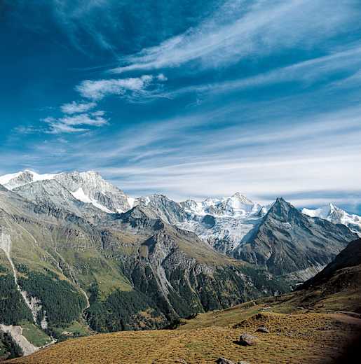 Schaukanzel hoch über dem Val d’Anniviers: Der Roc de la Vache zählt zu den großartigsten Aussichtsplätzen über dem Val d’Anniviers. Besonders zu erwähnen sind hier die Blicke auf den wild zerklüfteten Mominggletscher mit dem spitzen Zinalrothorn und auf den dunklen Felszahn des Besso sowie in die Nordostflanke der Dent Blanche.