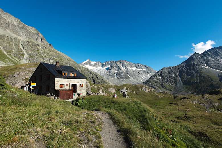 Von der Cabane de Chanrioneröffnen sich interessante Blicke auf die wenig bekannte Ostseite des Grand Combin. In dieser Hütte kann man auch übernachten.