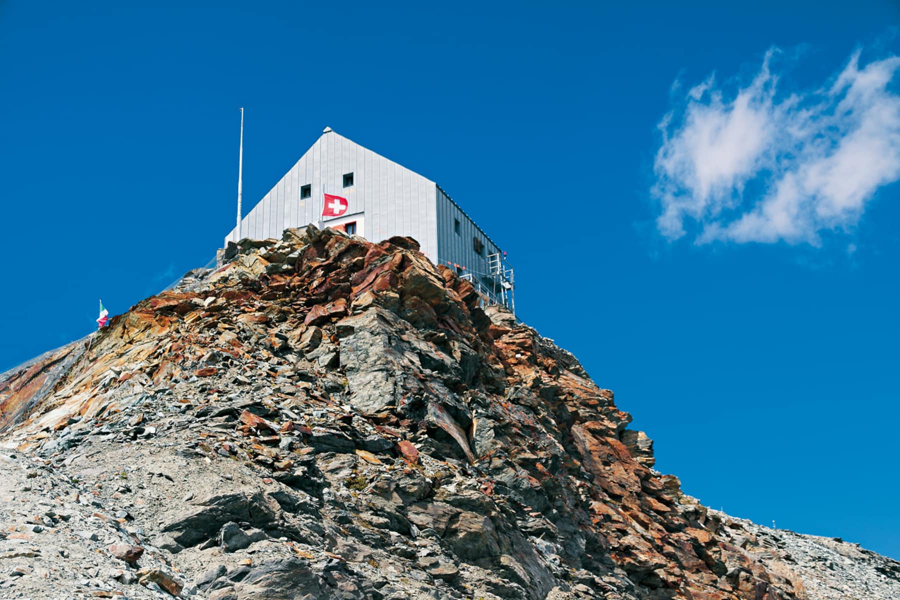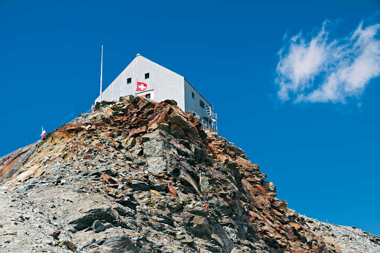 Im Angesicht des Matterhorns geht es jetzt über freie Mattenhänge, die nach oben hin zunehmend schütterer und schließlich von den Schliffzonen der „Lichenbretter“ abgelöst werden, Richtung Trockener Steg, 2.939 m, hinauf. Dieser stattliche Seilbahnkomplex ist ein gegen den Gletscher vorgeschobener Posten des Massentourismus und für Eilige der vorteilhafteste Ausgangspunkt.