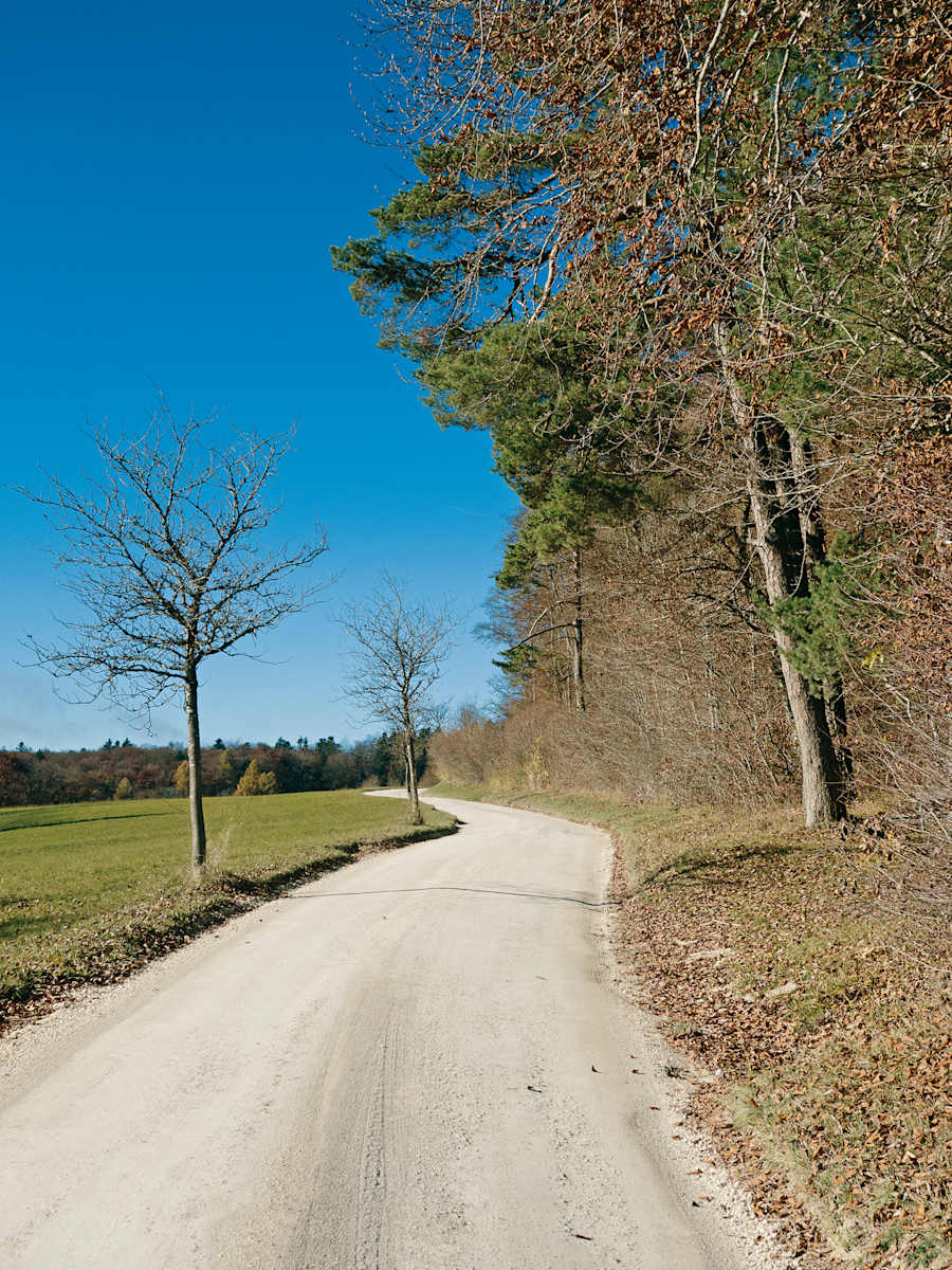 Bei der folgenden Waldecke bleiben wir gerade und steigen noch etwas ab bis zum Winkelacker. Hier gehen wir links Richtung Hemmental (Variante geradeaus). Die Naturstraße führt uns ein längeres Stück durch Wald und am Ende zum Aussichtsbänkli Uf der Stig.