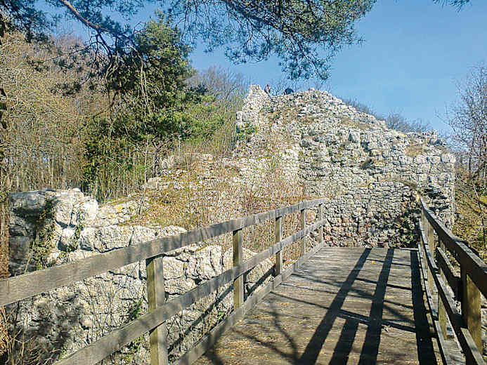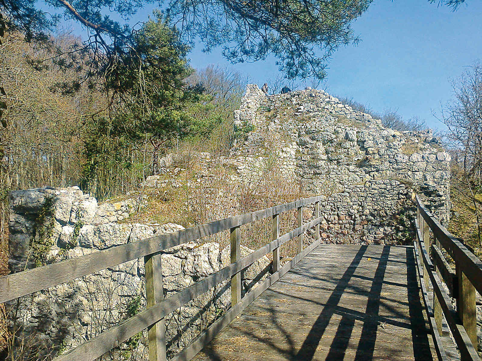 Wir betreten die Ruine über die Holzbrücke und können auf den befestigten Mauern bis zum höchsten Punkt klettern (Vorsicht!). Um zum Rastplatz über der Burg zu gelangen, müssen wir die Ruine wieder über die Brücke verlassen und im Bogen um die Mauern herumgehen.