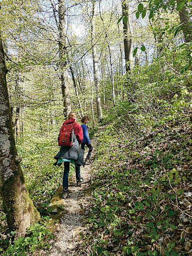 Wir wandern über dem Bad Osterfingen vorbei, das schon die Römer benutzten, und laufen ins Wangental. Nachdem der Weg an den Waldrand gekommen ist, biegen wir links in ein Seitental ein. Bald beginnt zur Rechten der schmale Pfad, der uns über eine Krete zur Burgruine Radegg hinaufführt.