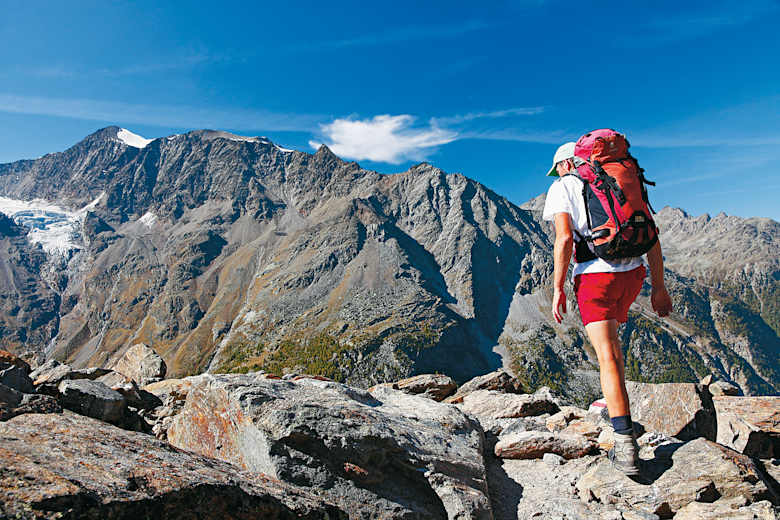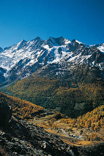 Im Banne der Mischabelgruppe in den Walliser Alpen: Das Schweizer Saastal wird an seinen beiden Flanken von Höhenwegen begleitet, die als Musterbeispiele für herrlichstes Panoramawandern gelten dürfen. Diese Wanderung ist der östlichen Seite gewidmet und damit dem klassischen Gsponer Höhenweg, der in den Neunzigerjahren mit der Verlängerung bis zur Almagelleralp eine fantastische Zugabe erhalten hat. Einen ganzen Tag lang können wir uns hier von der gegenüberliegenden Mischabelgruppe fesseln lassen, von einer eisbewehrten „Skyline“, die selbst im Wallis wenig Ebenbürtiges kennt.