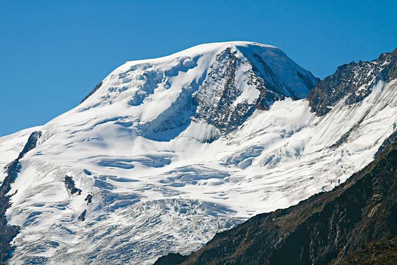 Der unverwechselbar geformte Alphubel entragt dem zerklüfteten Feegletscher. Foto: Mark Zahel