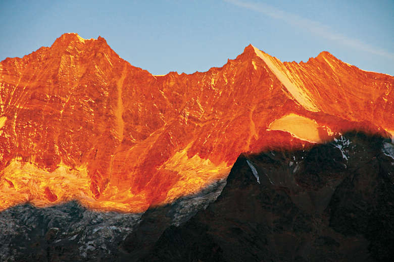 Fast überirdisch erstrahlt die Mischabel im Widerschein der Morgensonne. Foto: Mark Zahel